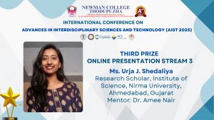 Ms. Urja J. Shedaliya, PhD scholar at the Institute of Science, Nirma University, working under the guidance of Dr. Amee Nair, was awarded the Third Prize for the Best Oral Presentation at the International Conference on Advances in Sciences and Technology (AIST 2025) which was held in hybrid mode from December 19 -21, 2025 at Newman College, Thodupuzha, Kerala . Ms Urja participated and presented her research work titled “Glycemic Fluctuation-Induced Modulation of Slit-Diaphragm Proteins and Barrier Integrity in the Diabetic Kidney” in the online session and was recognized for its scientific rigor.